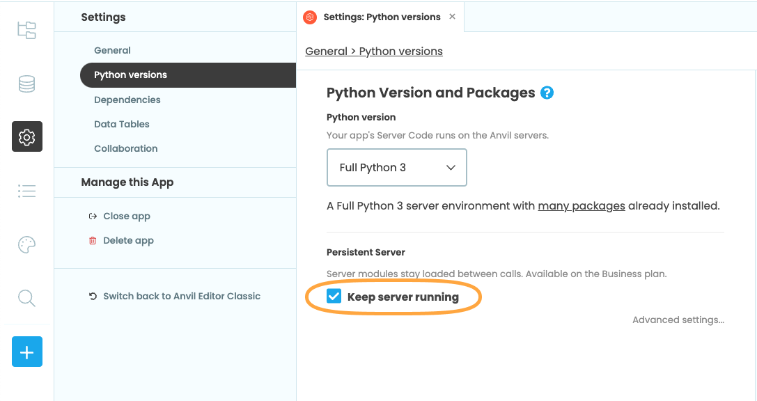 Enabling Persistent Server Modules by checking ‘Keep server running’ allows the same interpreter to be used for multiple function calls.